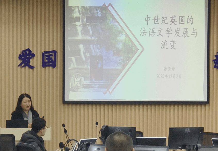 讲座中,张亚婷教授以盎格鲁-诺曼语为切入点,系统梳理了中世纪英国盎格鲁-诺曼历史和文学的发展脉络。她指出,盎格鲁-诺曼语文学与拉丁语文学、中世纪英语文学共同构成英国文学“三足鼎立”的格局,是英国文学史上不可或缺的重要组成部分。张教授从历史语境与文学特质双重维度选取关键节点,围绕籁歌、传奇、生平写作、寓言诗、抒情诗、游记、卷轴编年史等体裁,深入阐释了盎格鲁-诺曼作家在创作中与欧陆文学的深度互动及本土化创新历程。她强调,理解这一跨海峡文学交融的历程,有助于全面把握中世纪英语文学的发展渊源与贡献。