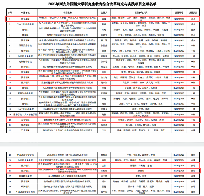根据学校《关于公布2025年研究生教育综合改革研究与实践项目的通知》,经个人申报、学院推荐、专家评审及校内公示等程序,我院6项研究生教育综合改革研究与实践项目成功获批立项,其中重点项目1项、一般项目3项、自筹项目2项。