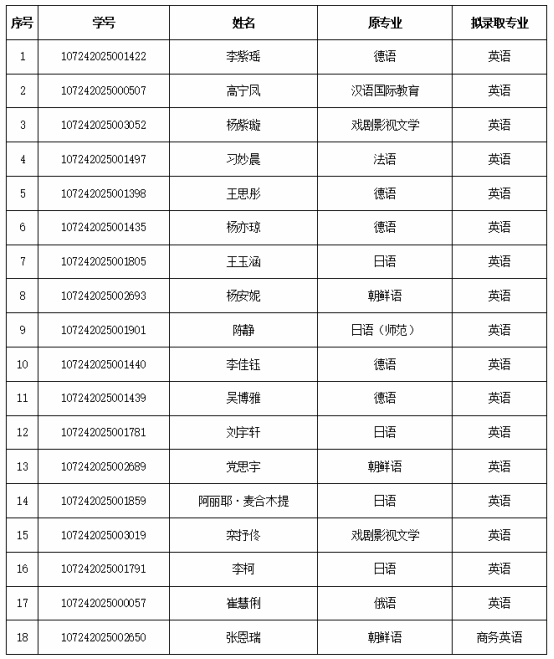 根据《关于做好2025级本科生第一学期末转专业工作的通知》要求,经学生申报、资格审查、学院笔试、面试考核,教务处审核通过,现拟录取李紫瑶等18名学生转入我院2025级英语、商务英语专业学习。