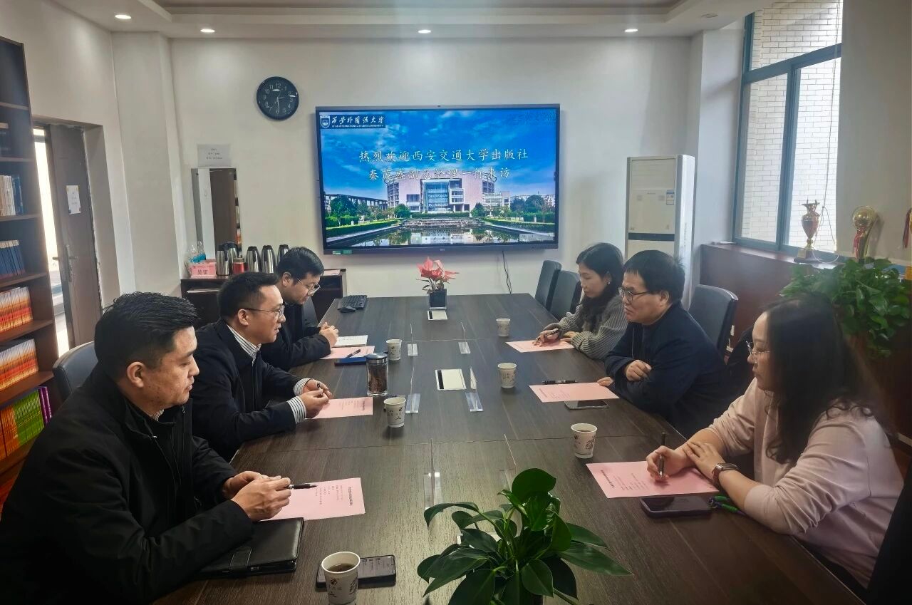 为深化校企合作,推动教材建设与学术传播深度融合,11月21日下午,西安交通大学出版社副总经理兼副总编辑秦茂盛、人文社科分社英语项目主管李蕊、策划编辑牛瑞鑫一行赴英文学院开展调研座谈。冯正斌院长、宋义国副院长及刘军伟教授出席会议。